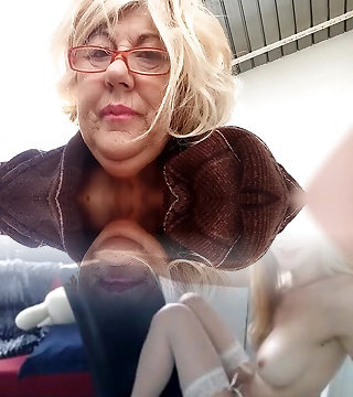 Sexy mature blonde in lingerie masturbates by fucking her cootchie with a G spot vibrating dildo