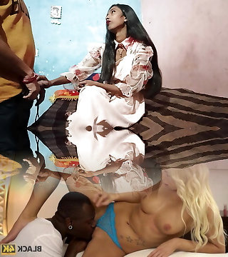 Girl with hairy pussy gets a large splatter on her face and ebony cock fucks her hairy pussy and cums